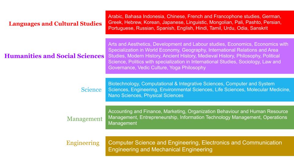 | School of Sanskrit and Indic Studies (SSIS) | MA, PhD | 316 | Sanskrit, Pali, and Prakrit Studies, Indian Philosophy, Ayurveda, Computational Sanskrit |